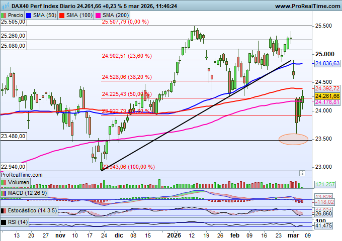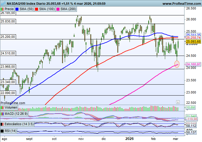 El tecnológico Nasdaq 100 tampoco ha sufrido un golpe tan importante como los índices europeos, que han perdido incluso directrices alcistas clave. En el caso del Nasdaq 100, la media móvil de 200 períodos, situada en los 24.160 puntos, ha servido como soporte dinámico, permitiendo que el índice mantenga su comportamiento técnico de corto plazo.