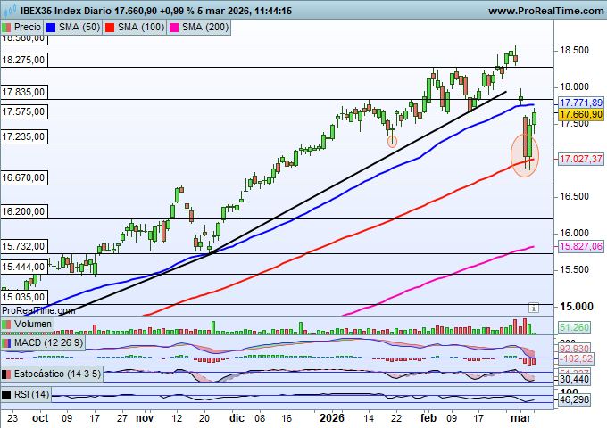 El selectivo español alcanzó la zona de máximos históricos el pasado viernes, llegando intradía a los 18.573 puntos, pero la fase correctiva intensa vivida posteriormente lo ha llevado hasta la zona próxima a los 17.000, donde ha encontrado soporte en la media móvil de medio plazo. Este nivel ha permitido a los bajistas frenar su presión y generar un rebote al alza que, por ahora, supera los máximos de las dos últimas jornadas.