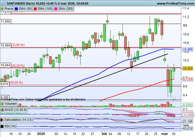 En cuanto a valores, destacan los títulos de Banco Santander, que están repuntando desde una zona de soporte clave: el 61,8% de Fibonacci de todo el último proceso alcista iniciado desde los mínimos de octubre hasta los máximos históricos de febrero. Esta referencia se sitúa en la zona de los 9,25 euros por acción, desde donde se ha producido una reacción al alza acompañada de un volumen de negociación relevante.