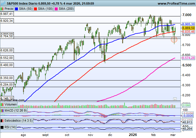 El S&P 500 logró recuperar incluso en la misma sesión la zona de los 6.800 puntos que se había perforado a la baja. Actualmente, los futuros presentan un comportamiento mixto y el índice sigue moviéndose dentro de un rango lateral.