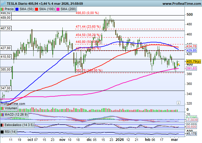 Por tanto, Tesla se posiciona como uno de los valores con mayor potencial técnico de recuperación en el mercado americano, ofreciendo garantías de continuidad alcista mientras se mantenga por encima de los 382-391 dólares. Solo con una caída por debajo de los 380 dólares se incrementarían significativamente las posibilidades de nuevos retrocesos.
