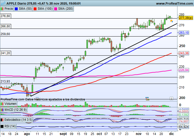Este repliegue de posiciones aligeraría los niveles de sobrecompra existentes y ofrecería una oportunidad de trading interesante desde el punto de vista técnico. Si Apple cotizara en los entornos de los 271 dólares por acción, esto nos daría una señal de entrada para trading, con un primer objetivo en 280 dólares y un segundo objetivo en la zona de los 290 dólares por título.