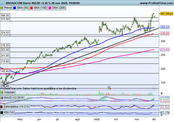 En este sentido, analizamos los títulos de Broadcom, que técnicamente se encuentran en una tesitura muy alcista, mostrando una formación de mínimos y máximos crecientes. El valor ha protagonizado un importante repunte desde la zona de los 332 dólares por título y acaba de superar, durante los últimos compases de la semana pasada y del mes de noviembre, la zona de los 386 dólares, que constituía su techo de mercado a corto plazo.