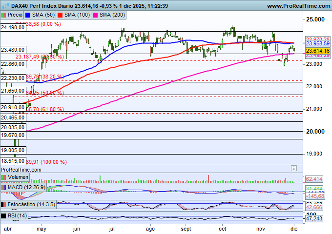 Las medias móviles, que pasan justo por en medio del lateral, no influyen ni positiva ni negativamente en el comportamiento del DAX alemán, que hoy consolida niveles tras un repunte experimentado desde la zona próxima a los 23.000 puntos.