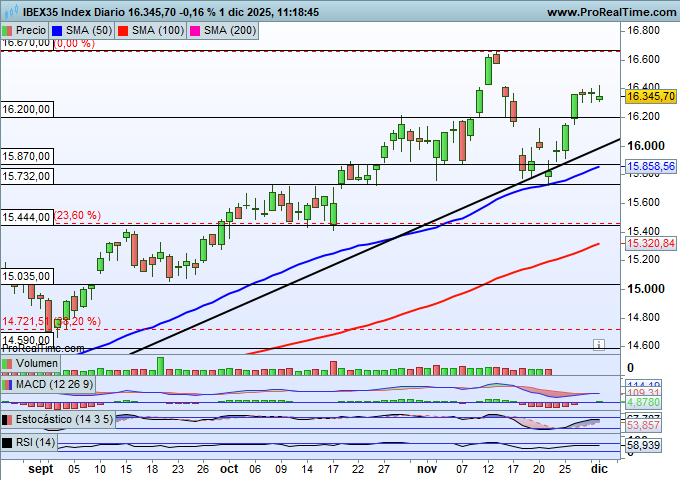 El nivel clave de los 16.400 puntos está siendo determinante para frenar el ímpetu de los alcistas y evitar que se acerquen a los máximos históricos alcanzados el pasado mes de noviembre.