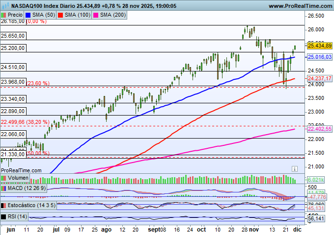 Por su parte, el tecnológico NASDAQ-100 también está constituyendo, al igual que el S&P 500, un importante rebote técnico con origen en la zona próxima a los 24.000 puntos, desde donde los alcistas han reaccionado con fuerza, encadenando hasta el pasado viernes cinco jornadas consecutivas de avances. Estos podrían tener hoy su finalización, ya que los futuros americanos se encuentran ahora mismo en rojo.