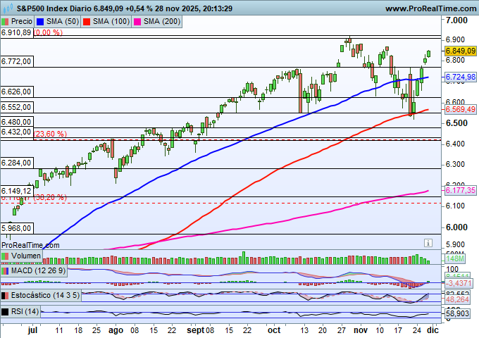 A esta hora, el SP500, pese a los recortes puntuales que puedan producirse durante la tarde, muestra todos los visos de ir a buscar la zona de referencia y resistencia en los 6.920 puntos, coincidiendo con los máximos del pasado mes de octubre.