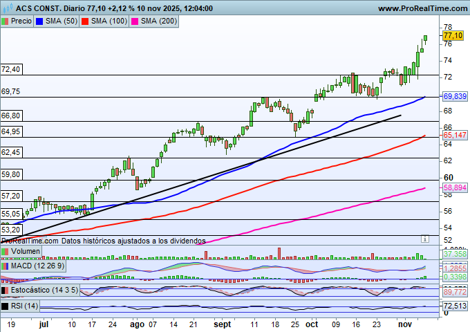 Entre los valores protagonistas, destaca ACS, que sube un 2,12% en la sesión de hoy, consolidando una sucesión de mínimos y máximos crecientes iniciada hace tiempo. Habría que remontarse al ejercicio 2023 para encontrar alguna zona de mínimos que pudiera considerarse suelo de mercado.