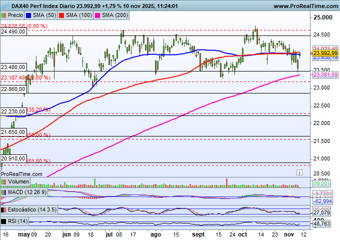 Teniendo en cuenta este comportamiento, podrían plantearse compras si el DAX se aproxima a niveles de 23.600 puntos, con un stop en 23.380 puntos y un objetivo en la zona de los 24.200 puntos. Por el contrario, si el índice se acerca a los 24.500 puntos, podría considerarse alguna posición bajista, esperando un retroceso hacia los 24.000 puntos, con un stop de protección por encima de los 24.700 puntos.