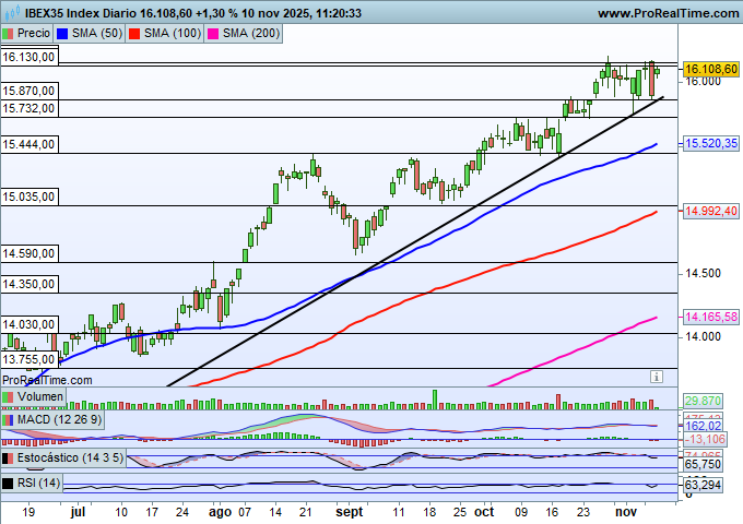 Es crucial que el índice no pierda los 15.870 puntos, ya que su ruptura pondría en riesgo la tendencia alcista actual. Por encima de los 16.200 puntos, algunos valores podrían ofrecer interesantes señales de compra.
