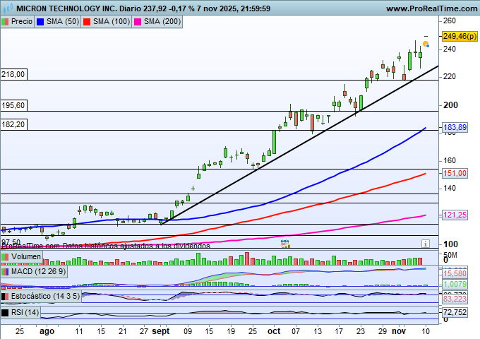 Actualmente, Micron Technologies se encuentra en subida libre técnica y absoluta, en gráfico adaptado a dividendo y ampliación, con un objetivo cercano a los 250 dólares por título, zona hacia la que podría dirigirse en la sesión de hoy.