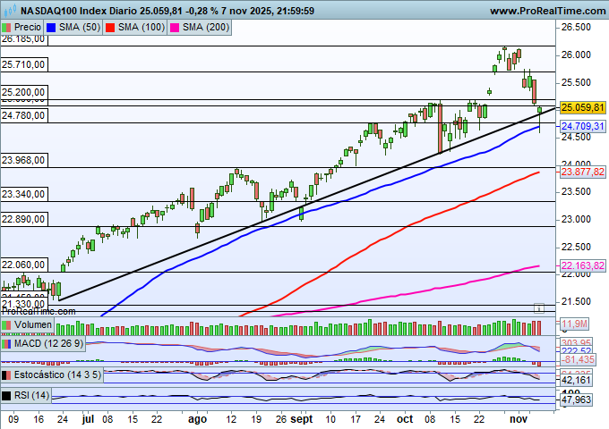 El pasado viernes, el NASDAQ-100 también dejó una pauta de interés: una vela en forma de martillo originada en la media móvil de 50 periodos, alrededor de los 24.700 puntos. Dado que los futuros americanos anticipan una sesión alcista, podría generarse una continuidad de este impulso técnico, con objetivos cercanos a los 25.500 puntos.