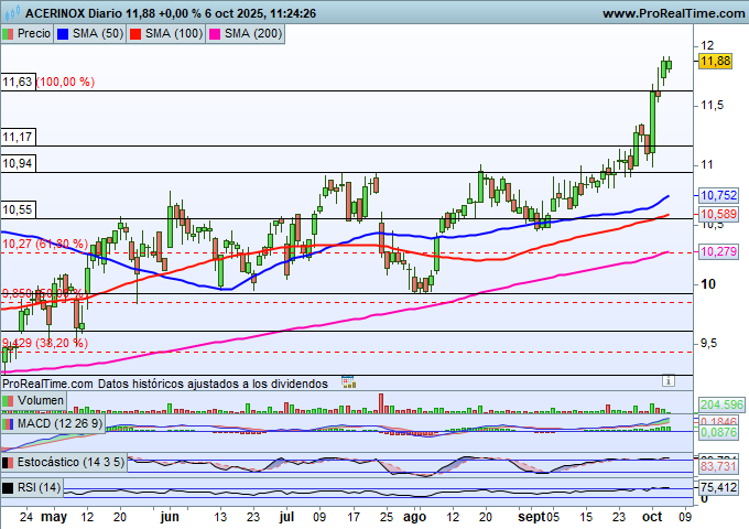 Actualmente, Acerinox consolida niveles, pero se encuentra muy cerca de la zona de los 12 euros por acción, que consideramos su primer objetivo ambicioso. La superación de este nivel abriría la puerta a nuevos avances interesantes en bolsa, impulsando aún más el precio de sus títulos, que siguen subiendo a buen ritmo.