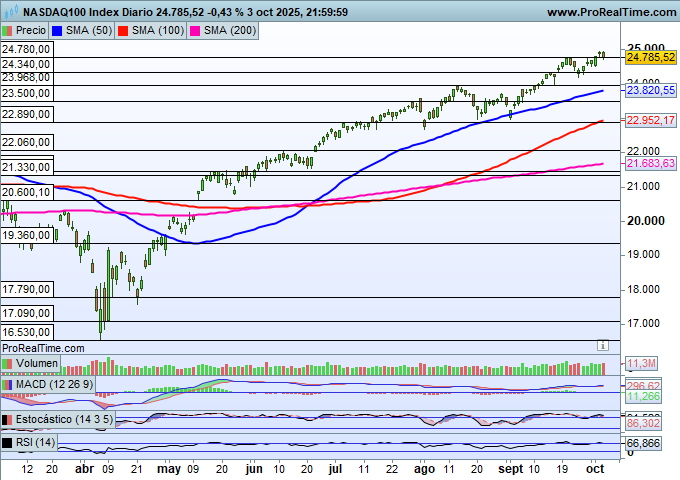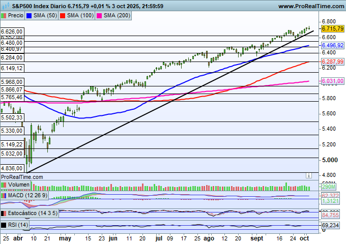 A pesar de que los niveles de sobrecompra alcanzados son muy extremos, esto no está suponiendo un impedimento para que el SP500 siga avanzando con un ritmo sólido, consolidando su estructura técnica y reforzando la confianza de los inversores en la continuidad de la tendencia alcista.