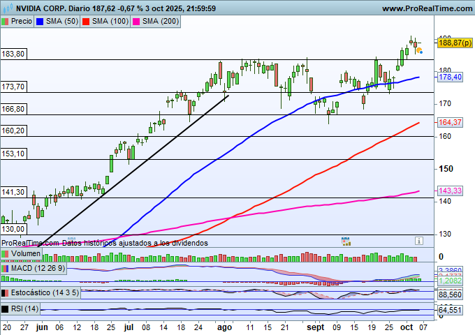 Si buscamos un valor fuerte tanto por fundamentales como por análisis técnico, y queremos alejarnos de los activos europeos, que en muchos casos ya presentan niveles de sobrecompra, nuestra atención se centra hoy en NVIDIA. El valor mantiene un comportamiento alcista en el corto, medio y largo plazo, con una formación de rebote y recuperación desde los mínimos del pasado mes de abril, cerca de los 87 dólares por acción.