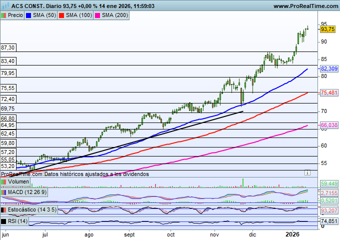 A pesar de la sobrecompra acumulada, ACS continúa subiendo, y cualquier retroceso es aprovechado por los inversores para retomar posiciones. A muy corto plazo, el valor mantiene una estructura sólida, con la apertura de un hueco al alza desde la zona de 88,75 euros por acción, que ha dado paso a un nuevo movimiento buscando los 95 euros.