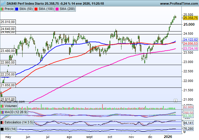 Las perspectivas siguen siendo alcistas, pero con cada avance aumenta la probabilidad de un recorte. Si finalmente se produce esa reacción a la baja, sería crucial que el DAX no pierda la zona de los 25.000 puntos en ningún caso.