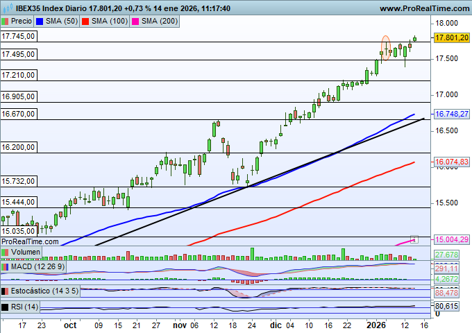 El ejercicio 2026 ha comenzado con alzas importantes para el IBEX 35 y, con casi medio mes transcurrido, se perfila como un año interesante. La sucesión de mínimos y máximos crecientes iniciada en abril en la zona próxima a los 11.565 puntos se traduce en un comportamiento muy alcista, con pauta clara de mínimos y máximos crecientes, siempre acompañada por la directriz que sigue el movimiento.