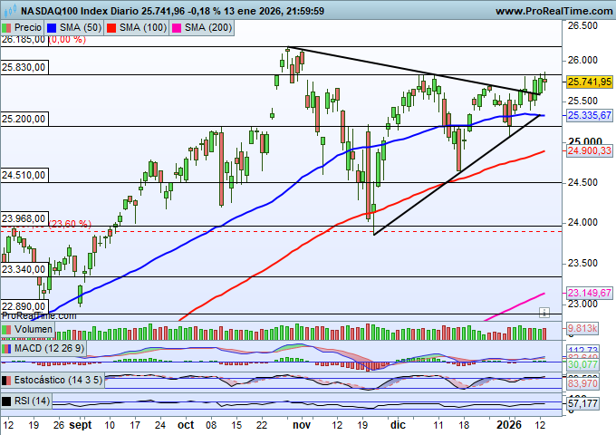 Técnicamente, el índice ha formado una figura de banderín entre los máximos de octubre y los mínimos de noviembre. Esta figura se está rompiendo al alza en las últimas tres sesiones, pero el Nasdaq 100 se enfrenta a la resistencia técnica de los 25.830 puntos.