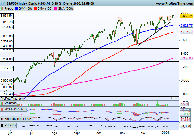 En lo que respecta a los índices americanos, el S&P 500 sigue avanzando, aunque de forma muy lenta. La cercanía de los 7.000 puntos podría frenar su impulso, ya que se trata de un nivel psicológico clave.