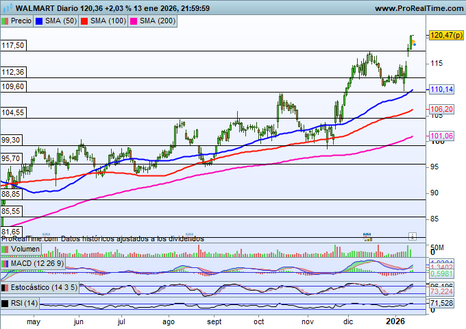 A partir de esa confirmación, Walmart ofrecería señal de entrada para trading, con un primer objetivo cercano a los 123 dólares por acción, equivalente a la anchura del último lateral, ya que el valor entraría en su “vida libre técnica” sin referencias intermedias. La orden de protección o stop se situaría por debajo de los mínimos de las dos últimas jornadas, es decir, por debajo de 116,40 dólares, tomando como referencia los cierres.